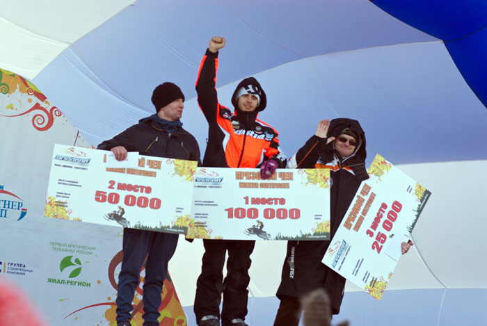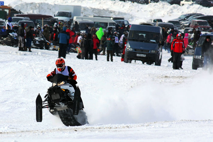 В общем-то, это все, что может увидеть на марафоне зритель. Длина трассы – два круга по 120 км по лесотундре, смотровых площадок там, естественно нет. Холодно. Гонщики жмут на всю железку, развивая скорость до невероятных 180 км в час. На финиш из-за аварий приезжают не все. В этот раз участник из Татарстана сломал ключицу, еще один получил легкое сотрясение мозга. Так что парни действительно смелые. Респект.