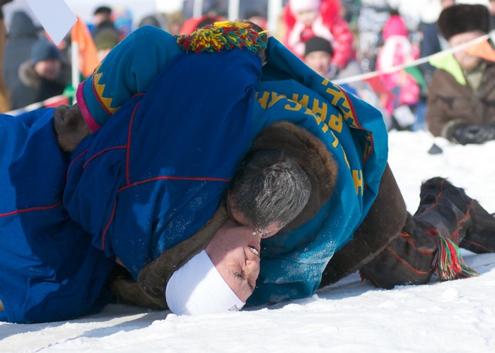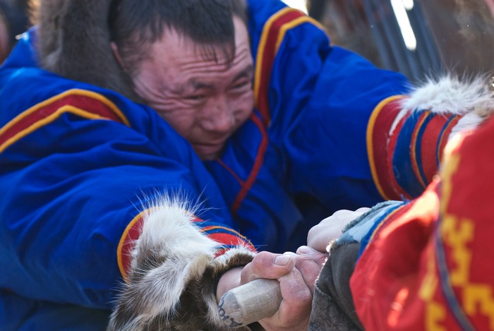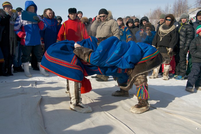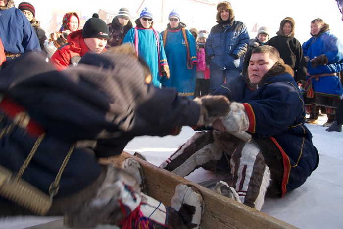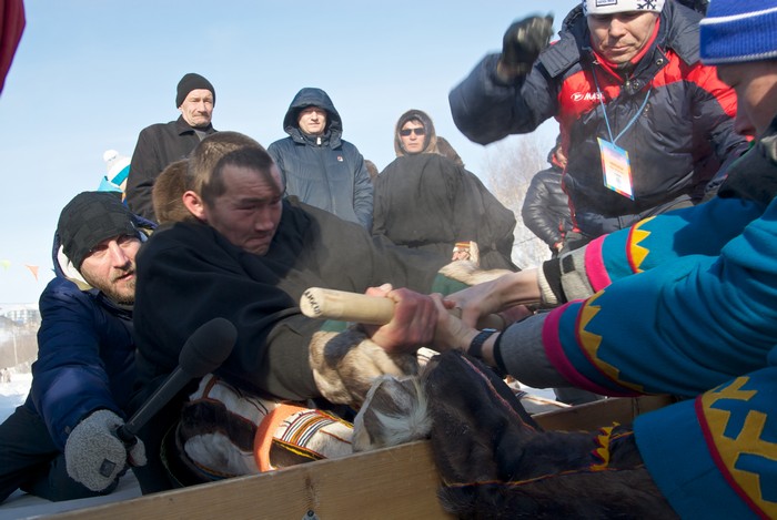 Праздник оленеводов продолжается: на большой снежный помост, возвышающийся над рынком, заходят желающие помериться силами в очередной забаве – перетягивании палки. Судья выкрикивает фамилии участников. Чаще других звучат эти: Саретэтто, Акатэтто и почему-то Ламтадер. Правила просты. Мужики садятся напротив друг друга, берутся руками за палку и упираются ногами в доску. Хват может быть или широкий, или узкий – это определяется жребием. По команде судьи надо или вырвать палку, или перетянуть соперника на свою половину.