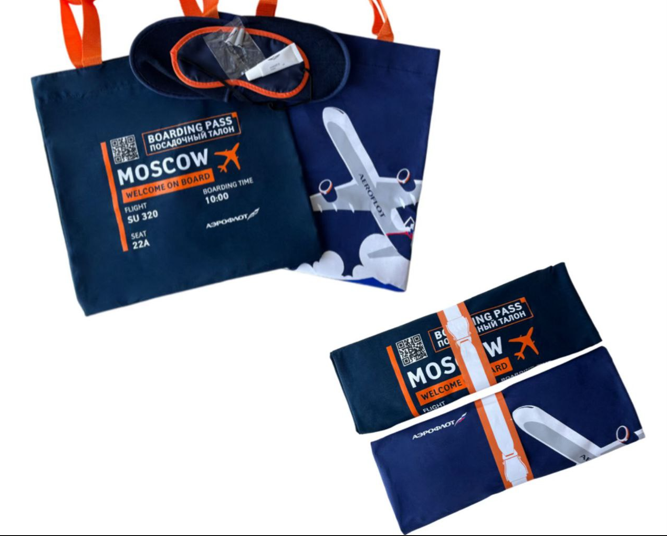 Вместо традиционных одноразовых пакетов пассажиры получат тканевые шоперы с двумя вариантами дизайна: синяя версия – с изображением самолета и логотипом авиакомпании; темно-синяя – со стилизованным посадочным талоном и QR-кодом, ведущим на официальный сайт «Аэрофлота».