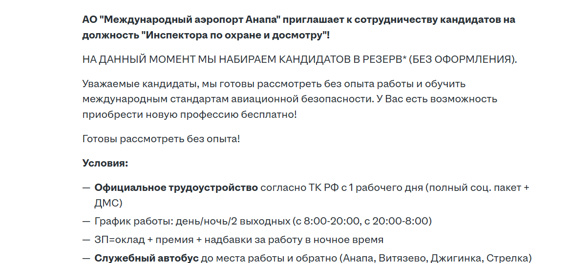 Как поясняется в вакансиях, это станет возможным, если появятся освободившиеся должности или откроются дополнительные ставки в компании в будущем. Инспекторов по досмотру обещают бесплатно обучить международным стандартам авиационной безопасности. Остальных просят лишь предоставить резюме и документы.