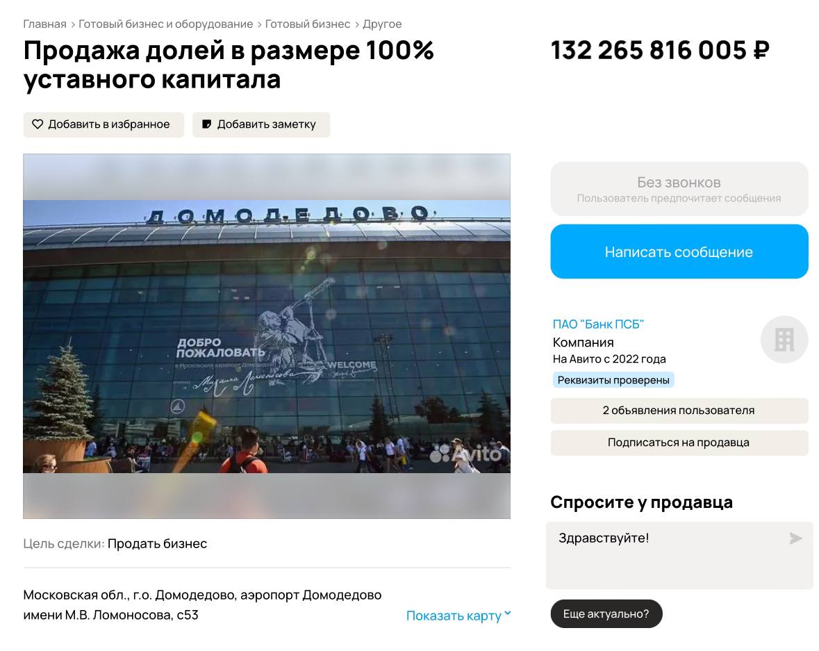 Аэропорт Домодедово оказался в списке лотов на «Авито». Объявление о продаже 100% долей опубликовал ПАО «Банк ПСБ» с начальной ценой в 132,3 млрд руб.