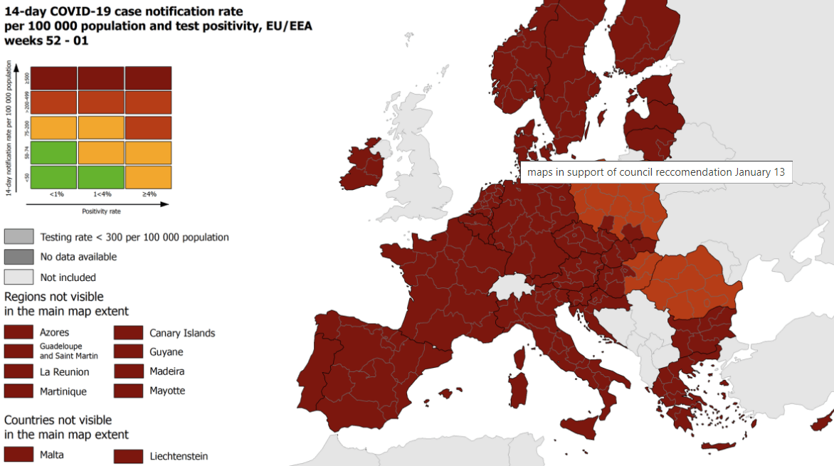 Отметим, осенью Европейский центр профилактики и контроля заболеваний публиковал более оптимистичные показатели. На карте, помимо «красных» и «темно-красных» зон, располагались также «оранжевые» и «зеленые», преимущественно в Западной Европе. Достаточно стабильная по распространению инфекции ситуация наблюдалась, например, в Италии, Испании, на Мальте, в Швеции, Франции.