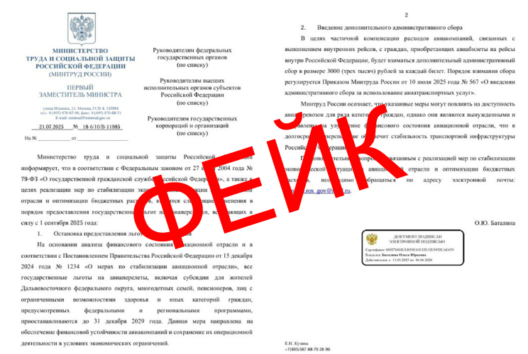 В интернете активно распространяется фальшивый документ, приписываемый Министерству труда РФ. В нем утверждается, что с 1 сентября 2025 года планируется отмена льготных авиабилетов и введение дополнительного платежа в размере 3000 руб. за каждый перелет. Однако данная информация не соответствует действительности и содержит множество признаков фальсификации, пишет портал 360.ru.