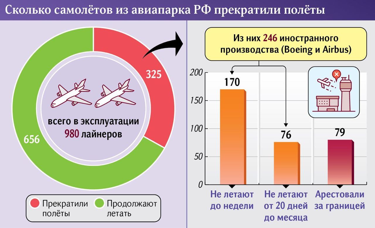 Судя по данным сервиса Flightradar, отечественные авиакомпании в марте 2022 года приземлили 246 самолетов Airbus и Boeing. С учетом российских лайнеров, оставшихся на бетоне, не используется треть от всего имеющегося коммерческого авиапарка (всего в эксплуатации – 980 ВС). Из них 79 самолетов арестованы за границей, 76 не летают от 20 дней до месяца, 170 не летают до недели.