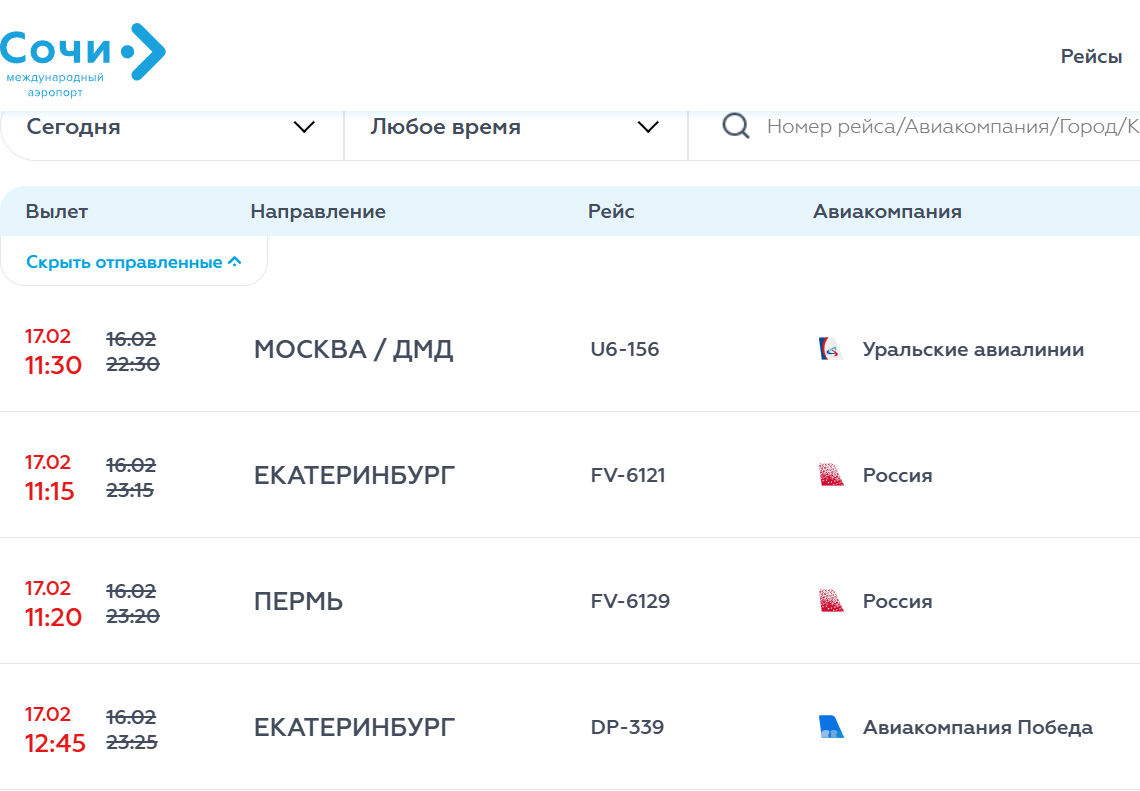 8 рейсов сегодня утром были отправлены из Сочи с опозданием в 12 часов. Это рейсы «Аэрофлота» и «Уральских авиалиний» в Москву, «России» в Пермь и Екатеринбург, «Победы» в Челябинск. На 10 часов позже улетит в Дубай самолет «Азимута». Обратный вылет также отложен – на 7,5. Часть утренних вылетов также серьезно отложены – на 4–6 часов.
