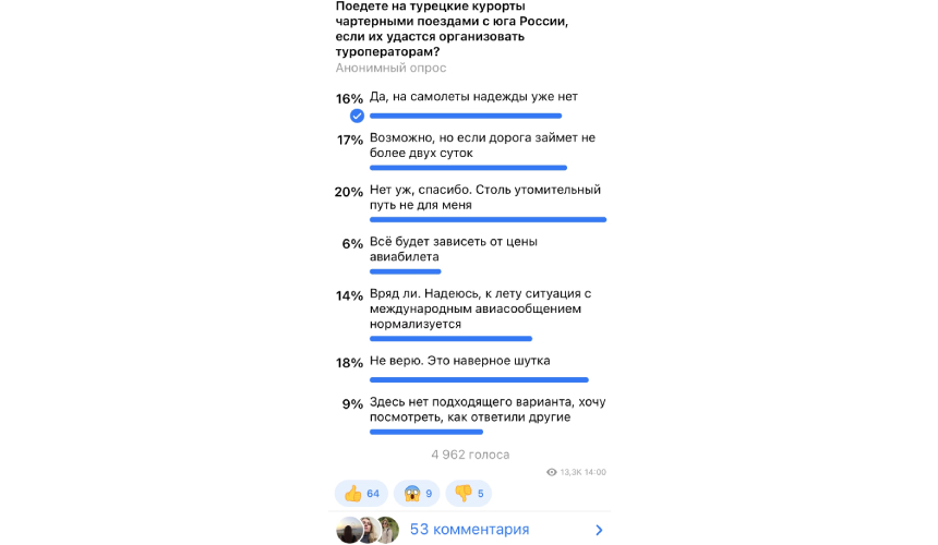 Опрос телеграм-канала «Крыша ТурДома» – «Поедете на турецкие курорты чартерными поездами с юга России, если их удастся организовать туроператорам?» – вызвал живой интерес аудитории. За 2 дня получено более 4800 ответов, что неудивительно – из-за западных санкций авиаперелеты в Турцию стали невозможны для большинства лайнеров отечественных авиакомпаний, туристы крайне заинтересованы в альтернативах, даже самых экзотических.