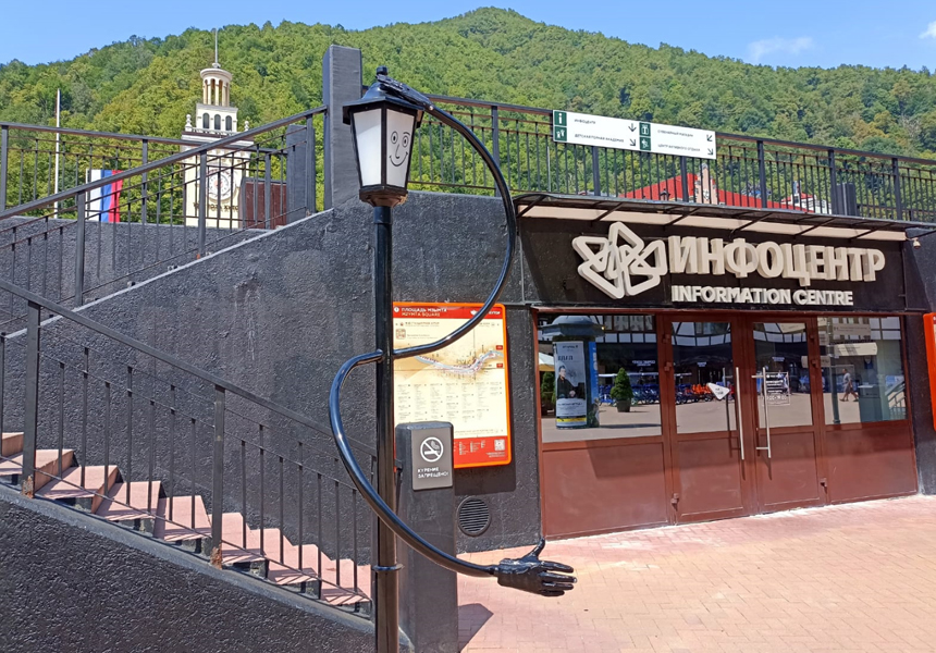 Новый арт-объект выглядит как обычный уличный фонарь. Однако его функционал не ограничивается только освещением пространства. Он обладает интерактивной способностью здороваться со всеми желающими. Креативная конструкция фонаря предусматривает специальную «руку», которую можно пожать. У него также имеются «лицо» и «шляпа». В ответ на рукопожатие «Фонарь-гостеприимец», улыбаясь, загорается и поднимает шляпу, приветствуя гостя курорта. Автором арт-объекта стал белорусский музыкант-тромбонист, художник Евгений Половинский.