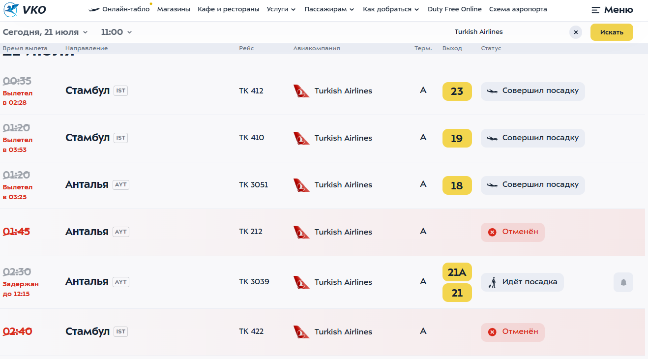 Основная причина задержек на вылет – позднее прибытие воздушных судов. Ночью один борт уходил в Домодедово, рейс ТК421 из Стамбула садился в Пулково, но после 5 утра он прибыл в пункт назначения: «Постояли час в Пулково, через несколько минут капитан сказал, что улетим в Москву». Отмененными значатся лишь два вылета из Антальи – ТК3002, ТК3038.