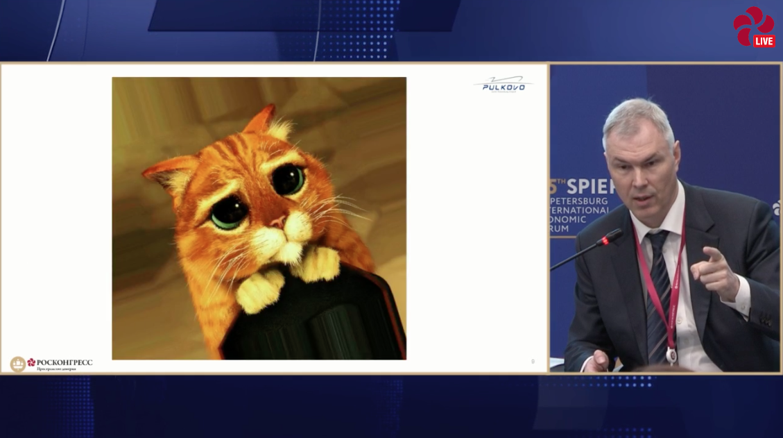 Кроме того, по словам Сергеева, огромный потенциал скрыт на Дальнем Востоке, где вкладывается очень много денег, но «нужно соединить наши деньги с их деньгами». Необходимо также субсидирование внешних дальних направлений, так как длительность полетов из-за ограничений увеличилась. «Это не 2 часа, а 4000 км, нужно программу сюда, и мы будем использовать просителя тысячелетия помочь нам в этом процессе», – завершил свою речь Сергеев, показав в презентации кадр с котом из мультфильма про Шрека. Зал встретил его речь аплодисментами.