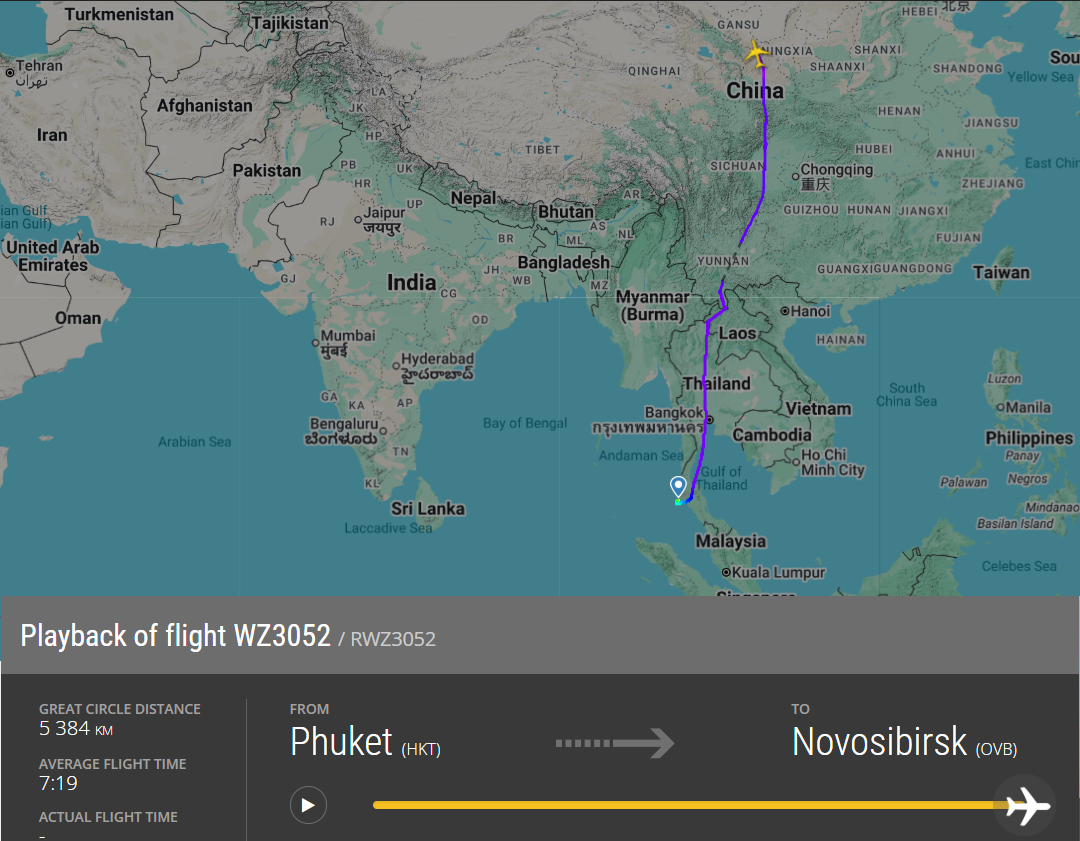 Минувшей ночью самолет выполнил рейс на Пхукет – борт вылетел из Домодедово в 19:00 и ранним утром прибыл на курортный остров в Таиланде. Спустя 2 часа он отправился в Новосибирск рейсом WZ3052. В Толмачево его ждут в 17 часов по местному времени. Обратный вылет на табло пока что так же, как и раньше стоит на 00:30, хотя в теории есть шанс серьезно сократить отставание от графика.