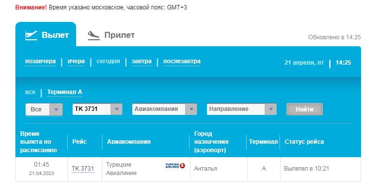 В частности, заметный сбой произошел 20 апреля. Тогда рейс TK 3732 отправился из Антальи с опозданием в 4 часа: вместо 07:35 в 11:47. Обратный TK 3733 вылетел из Внуково в 20:40, а не в 13:45, как планировалось изначально. Эта накладка повлекла за собой задержку рейсов TK 3730 и TK 3731. Они отставали от расписания на 7–8 часов соответственно.