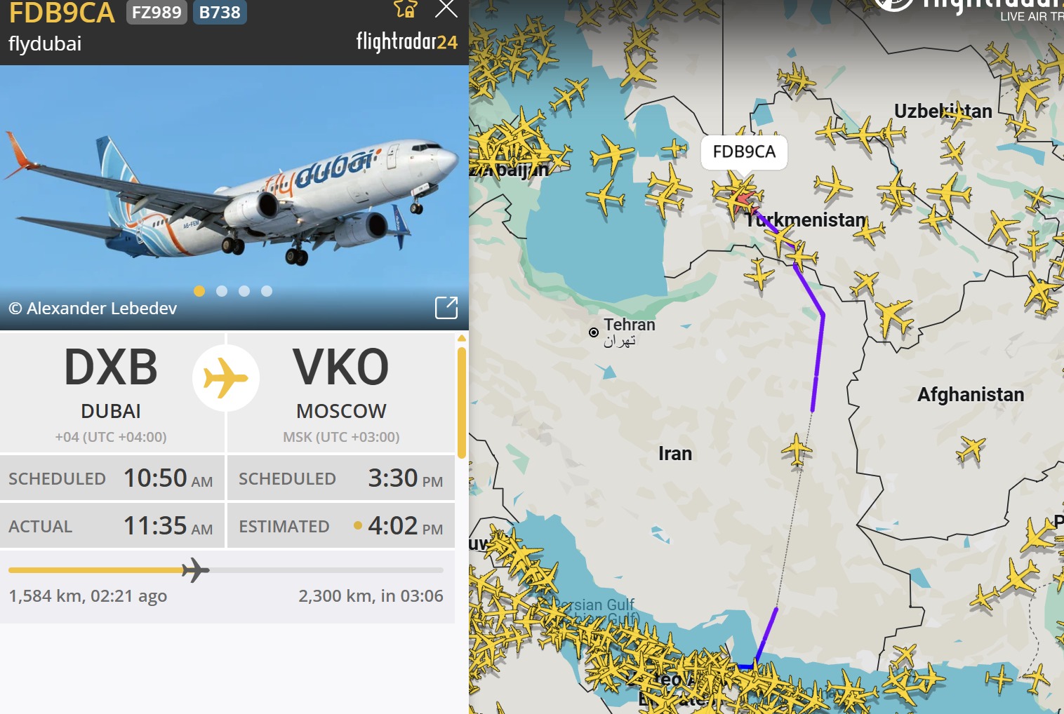 В частности, рейс FZ 989 из Дубая в Москву пролетел Иран и по состоянию на 13:40 двигался над Казахстаном. В воздушном пространстве Ирана также находились самолеты арабского перевозчика, направляющиеся из Дубая в Ашхабад (FZ 731) и из Баку в Дубай (FZ 710).