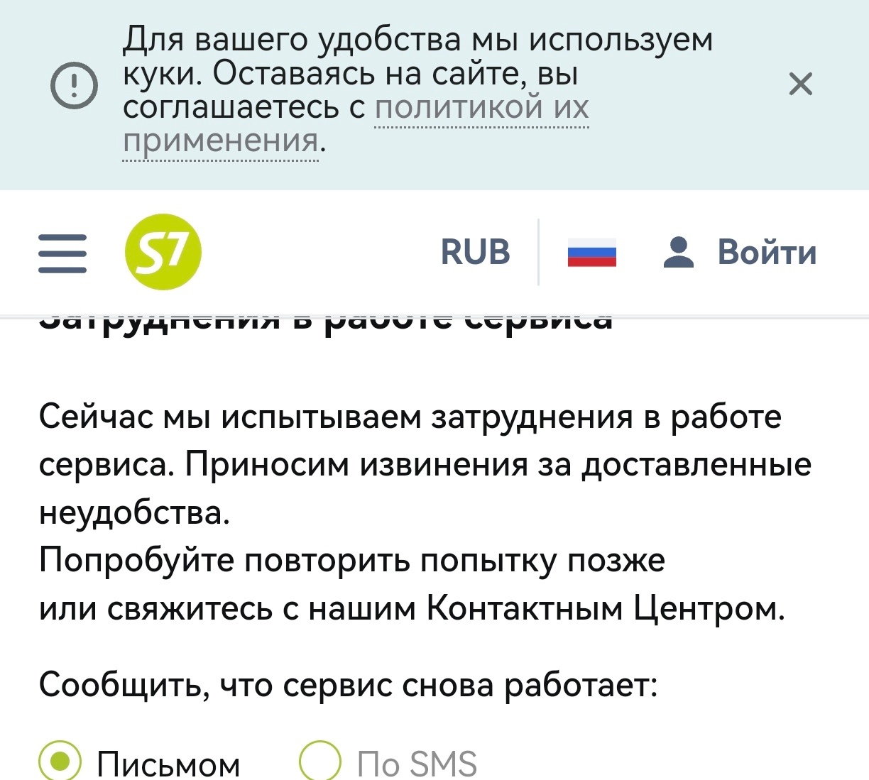 23 января S7 вместе с Яндекс.Плюс обещали провести закрытую распродажу для подписчиков последнего. Как рассказала одна из читательниц телеграм-канала «Крыша ТурДома», сайт авиакомпании не работает сегодня с 10 утра по московскому времени. При этом через приложение можно и найти и оплатить нужные билеты.
