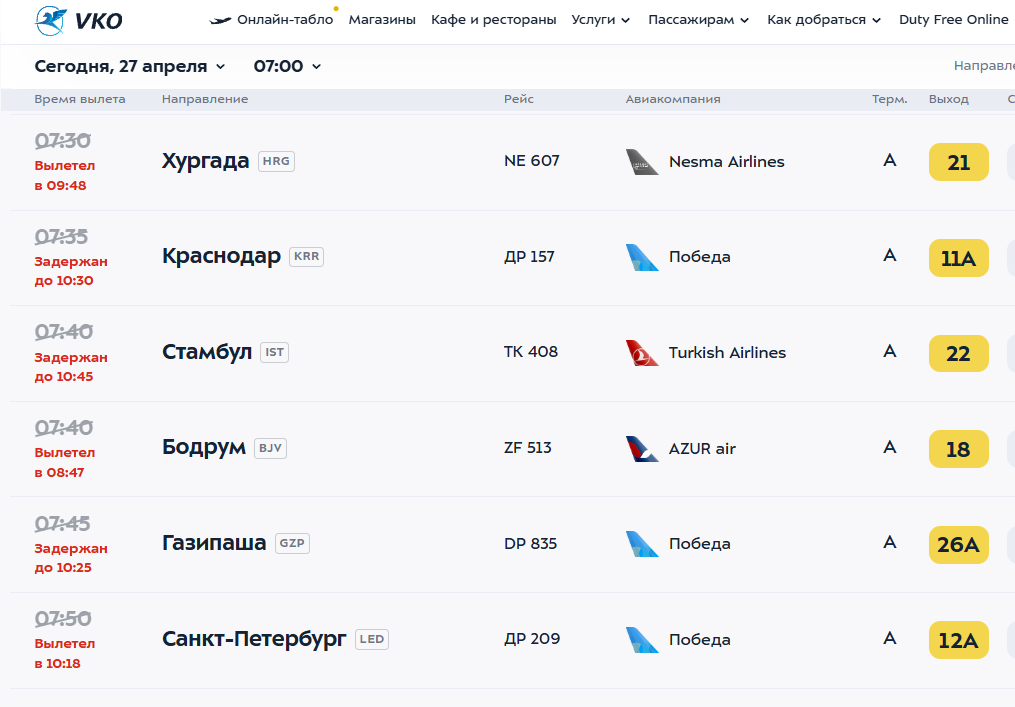 Больше всего красных строчек на табло Внуково. В аэропорту еще ранним утром предупредили, что командиры воздушных судов принимают решение о возможности вылета в связи с погодными условиями. По состоянию на 9:30 мск наибольшие задержки достигали 8,5 часа. Настолько была задержана отправка HY606 в Самарканд Uzbekistan Airways и UT363 в Уфу. Около 10 рейсов «Победы» по России и в ближнее зарубежье были сдвинуты вправо на 6–8 часов.
