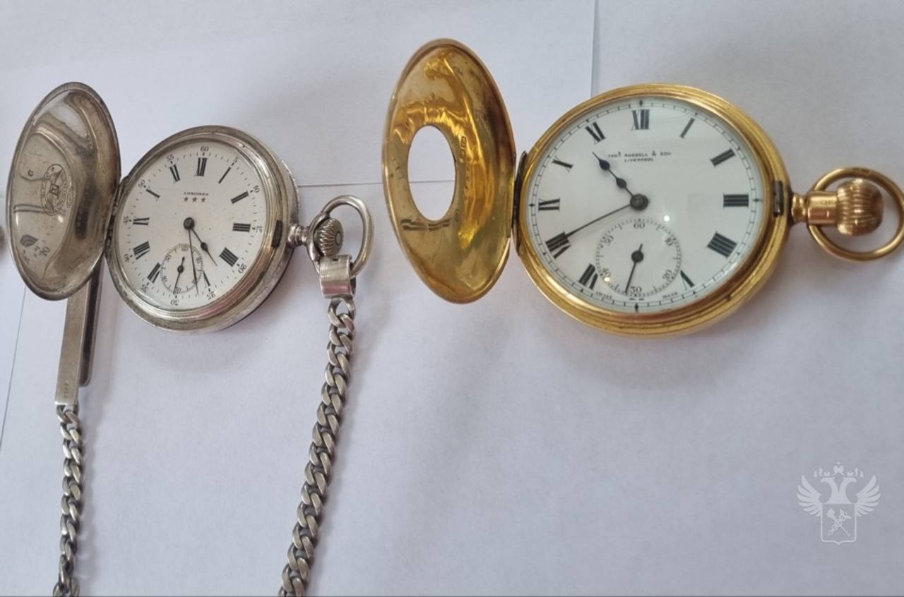 Как установила экспертиза, среди изъятых часов трое были произведены швейцарской фирмой Longines в период с 1923 по 1925 год. Особую ценность представляет экземпляр с серебряной цепочкой. Все они выполнены в закрытых серебряных корпусах 900-й пробы, имеют белые эмалевые циферблаты с арабскими цифрами и фирменными золотыми звездами. Четвертый хронометр является уникальным произведением британской компании Thomas Russell & Son Liverpul, примерно 1917 года выпуска. Он заключен в редкий 18-каратный корпус, украшенный искусной гравировкой.