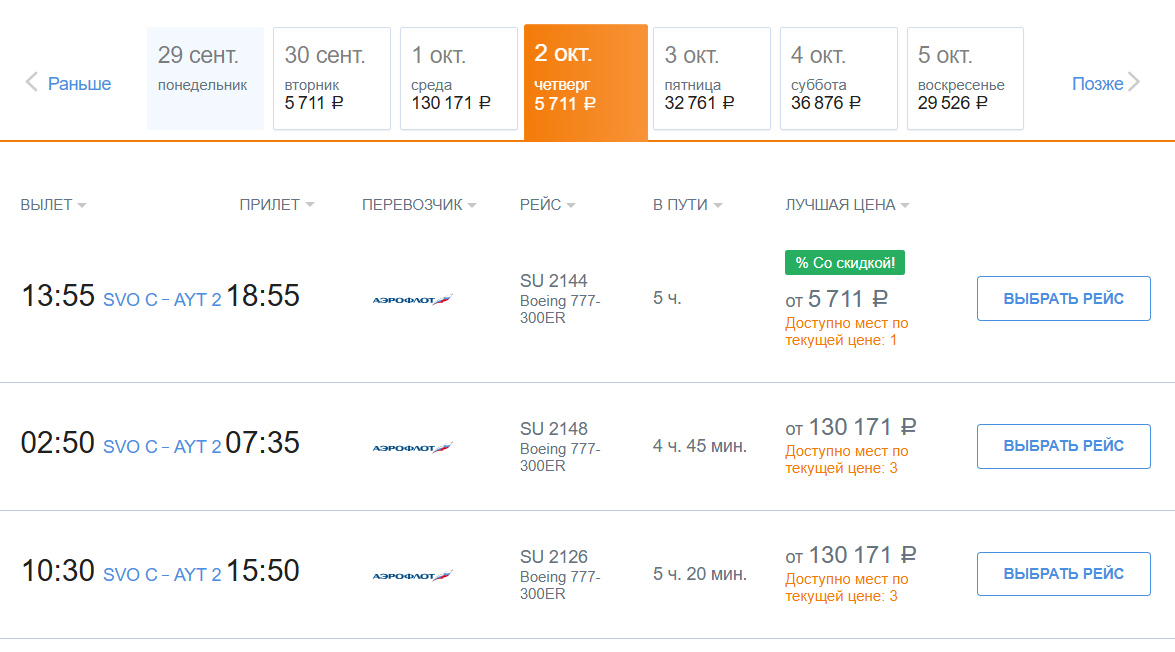 Из Москвы в Санью на 2 октября есть три рейса за 16,5 тыс. руб. и один – за 17,2. Из Петербурга же можно улететь за 13,6.