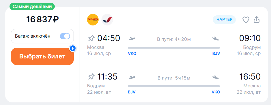 Воспользоваться столь выгодным прайсом можно, если улететь 16 июля из Внуково в 04:50 рейсом Pegasus. А вернуться предлагается на борту AZUR air 22 июля с вылетом с турецкого побережья в 11:35. Оба перелета чартерных.