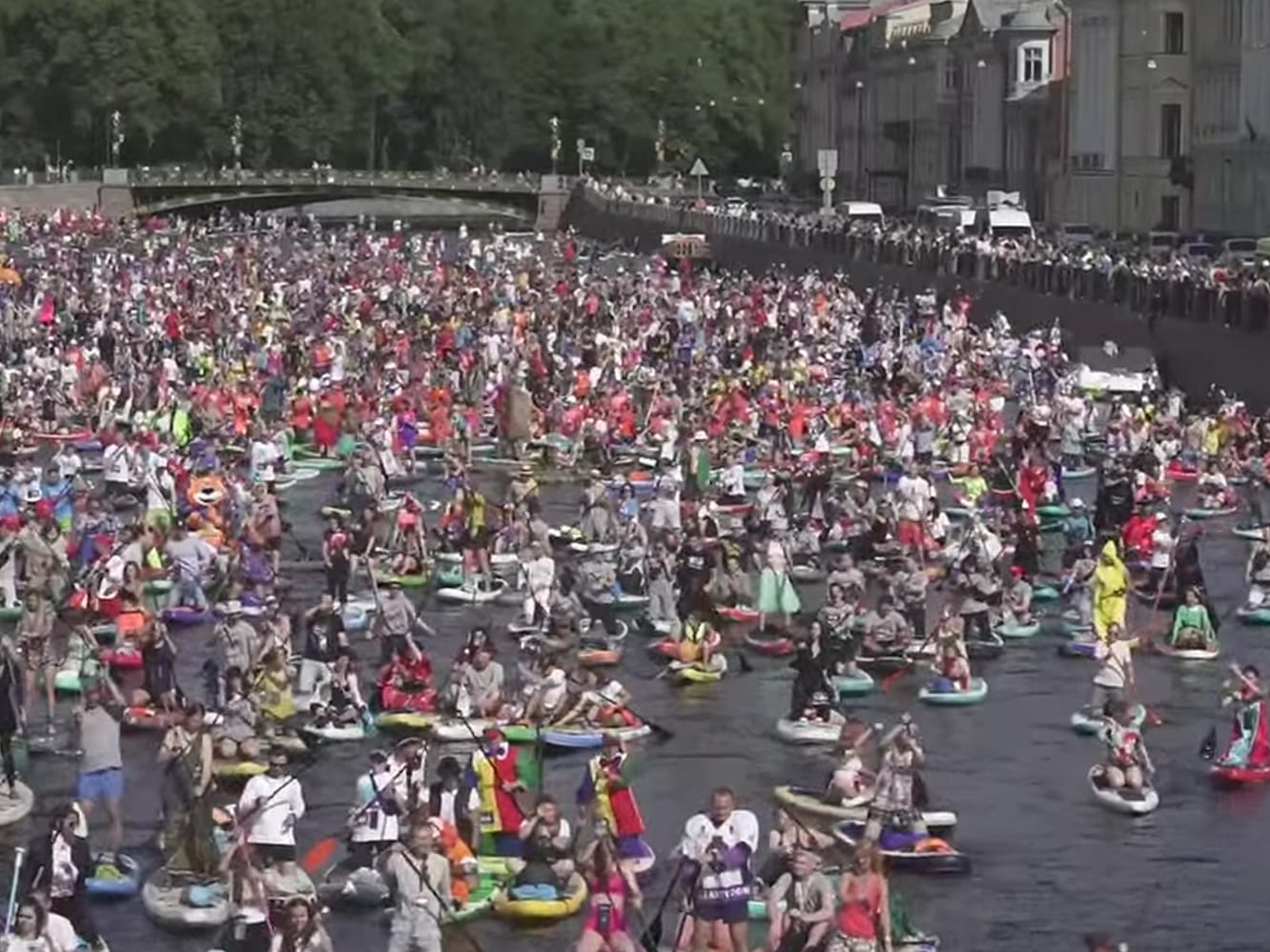 Уникальный по масштабам карнавальный заплыв на сапах состоялся в первую субботу августа в Санкт-Петербурге. Участники ежегодного фестиваля «Фонтанка SUP» прошли 9 км по каналам в центре Северной столицы.