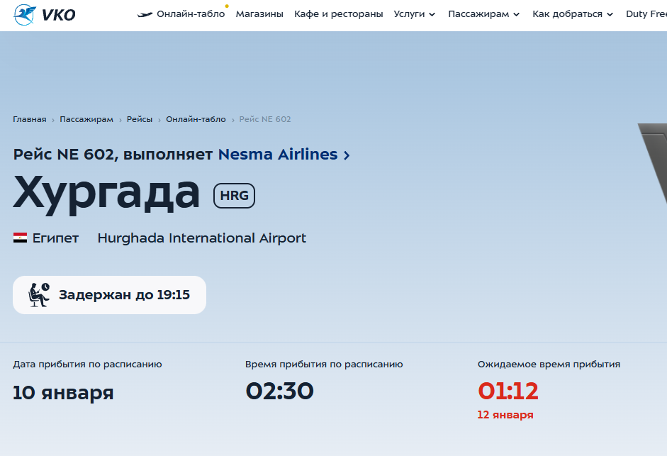 Далее борт вернулся на маршрут Хургада – Москва. Сейчас он делает уже второй круг и, если верить данным сервиса и онлайн-табло Внуково, вечером все-таки заберет пассажиров, ожидающих вылета двое суток. В России они должны приземлиться 01:12. Более 40 часов ждет отправки на курорт NE 603 из Москвы. Его планируют выполнить сегодня вечером. Сейчас на полетах в Россию задействованы три из восьми Airbus A320 египетской авиакомпании. На рейсах в Шарм-эль-Шейх также возникли сбои в расписании, но в меньшей степени.