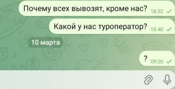 В подтверждение своих слов турист привел переписку с компанией в Telegram по номеру, который предложен для связи на сайте. «Почему всех вывозят кроме нас?» «Кто у нас туроператор?» – все эти вопросы остались без ответа вчера и сегодня в первой половине дня.
