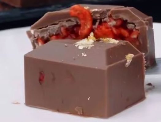 На видео мужчина в форме шеф-повара подготавливает начинку для будущего десерта – сухую лапшу «Доширак» в малиново-банановом соусе. Затем раскладывает полученную смесь по формам, заливает жидким шоколадом и пробует продукт.