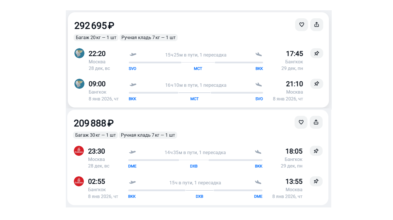 Впрочем, более низкие цены у Oman Air далеко не всегда. И даже в популярные даты может быть преимущество у Emirates. Так, в новогодние каникулы Emirates за места туда-обратно в Бангкок 28 декабря – 8 января просит 227 тыс. Oman Air готова доставить на курорт за 292 тыс. руб. с багажом. В данном случае, выбирая из этих перевозчиков, выгоднее слетать авиакомпанией из Дубая. Ну а лучший вариант в эти же даты снова у китайских авиакомпаний. Так, China Southern Airlines организует поездку с багажом до 23 кг за 154 тыс. руб., а China Eastern Airlines за 156 тыс. руб. Воспользовавшись этим вариантом, получится сэкономить более 70 тыс.