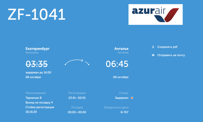 Рейс авиакомпании AZUR air из Екатеринбурга в Анталью задерживается более чем на 12 часов. Уральская транспортная прокуратура по данному факту уже инициировала проверку.