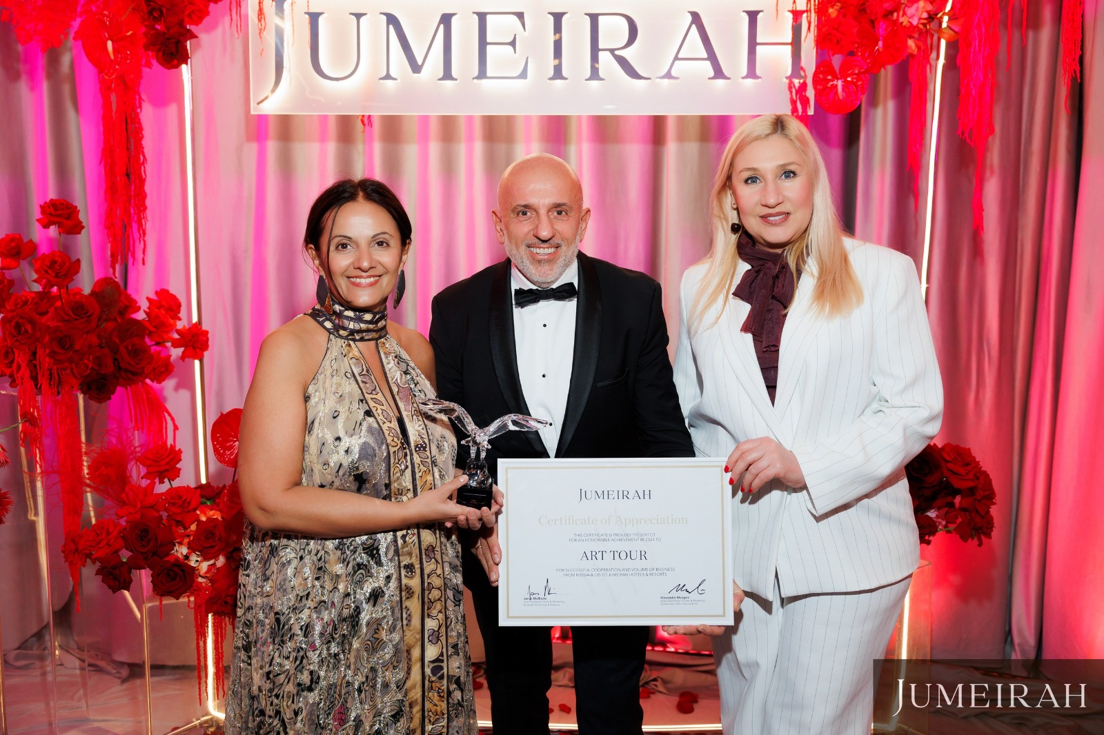 На торжественной церемонии награждения, прошедшей в Москве в середине февраля, генеральный директор «АРТ-ТУР» Дмитрий Николаевич Арутюнов выразил благодарность партнерам Jumeirah за многолетнее сотрудничество, поддержку и доверие. Особые слова признательности он адресовал туристическим агентам за их доверие и преданность бренду, а коллегам-«арттуровцам» – за высокий профессионализм.