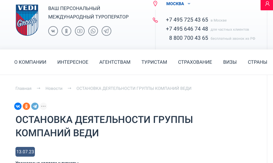 «Команда “ВЕДИ” более 20 лет профессионально создавала качественный и надежный турпродукт. Но события последних трех лет исчерпали все наши ресурсы. К сожалению, из-за целого ряда внешних обстоятельств – пандемии, отсутствия авиасообщения со странами Европейского союза, санкций недружественных стран, колоссальных проблем с валютными платежами и роста курса валют – стало невозможным продолжать дальнейшую борьбу. Приносим искренние извинения нашим коллегам, туристам и партнерам.