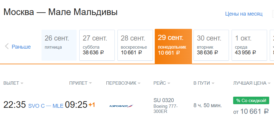 У туристов из столицы есть и другие варианты. Один из самых вкусных – за 10 тыс. улететь на Мальдивы 28 и 29 сентября. В другие дни будет заметно дороже – в лучшем случае 43 тыс., а то и все 60. Обратные рейсы нацперевозчик в начале октября также предлагает от 60.
