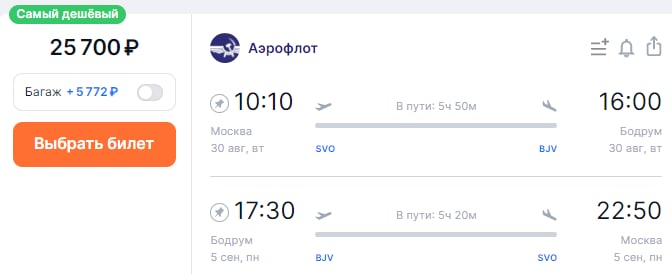 Так, прямым рейсом «Аэрофлота» можно слетать из Москвы в Бодрум и обратно всего за 25 700 руб. Такие билеты доступны с вылетом 31 августа и возвращением 5 сентября. В полете пассажиры проведут чуть больше 5 часов.