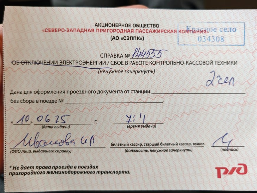 «При неисправности кассового оборудования или отключении электроэнергии пассажир может получить бесплатную справку для оформления билета в поезде без дополнительной платы. На станции Красное Село сегодня действительно были временные сложности, но кассиры также информировали пассажиров о возможности покупки билетов через мобильное приложение», – отметили в компании.