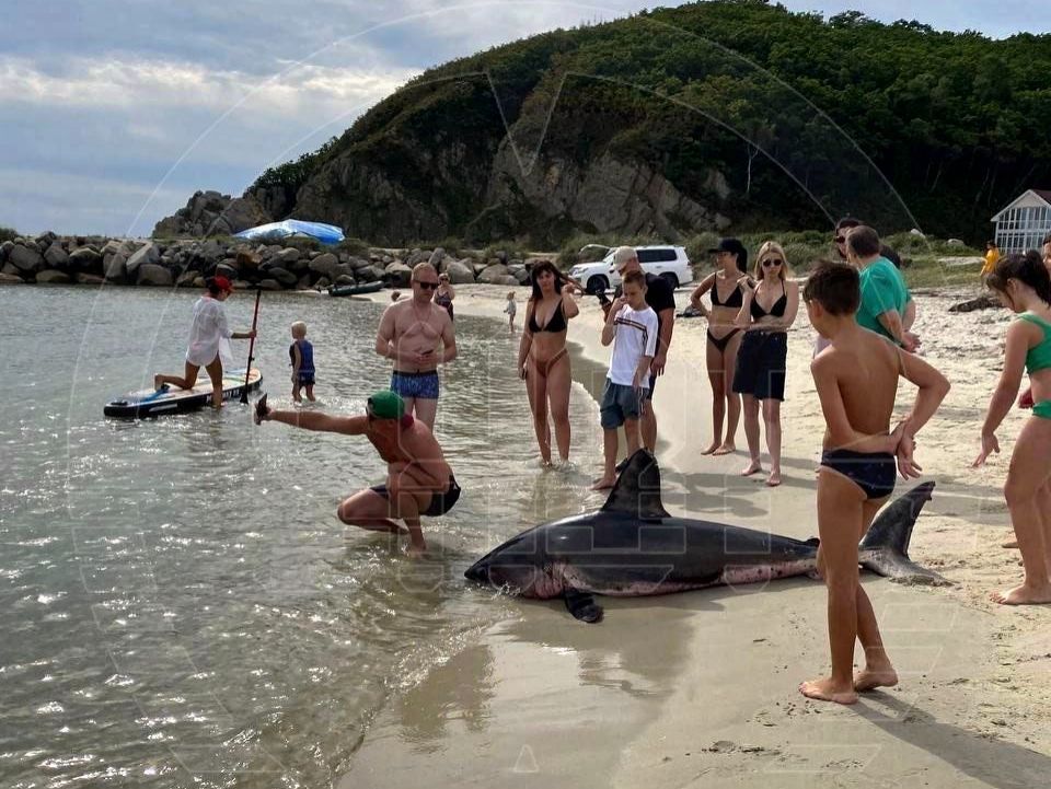 Сегодня утром на базе отдыха «Триозерье» в Приморском крае двухметровая акула напугала туристов, а затем смельчаки вытащили ее за хвост на берег. Как сообщает SHOT, желающих сделать селфи на память было достаточно.