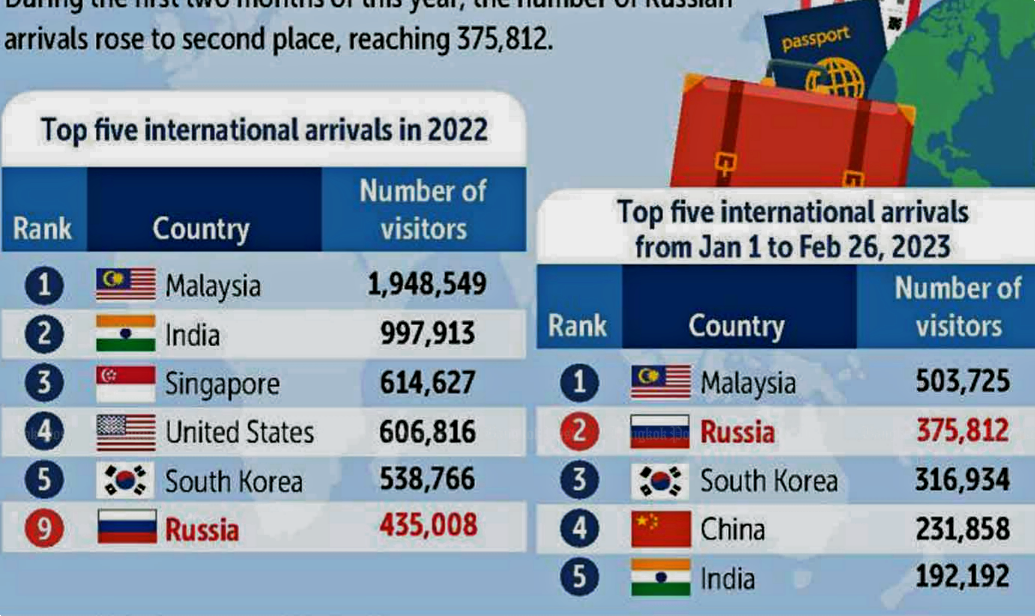 По данным иммиграционной полиции страны, наши соотечественники были третьими по численности в феврале среди иностранных гостей и вторыми – за январь-февраль.