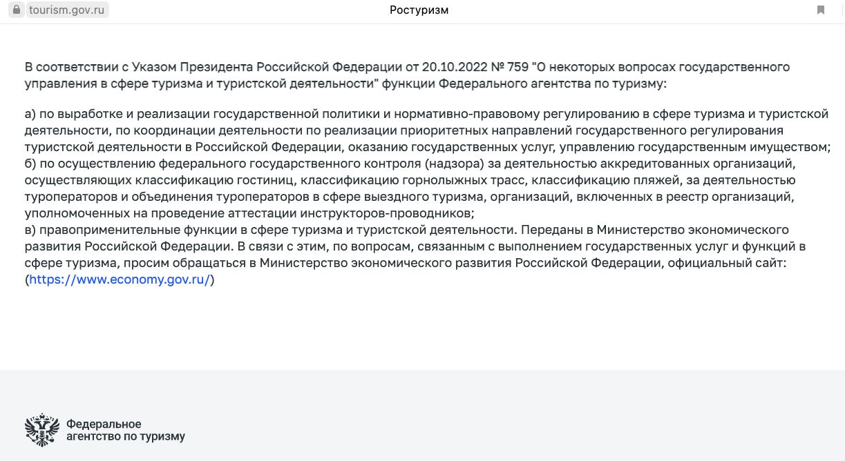 Сайт упраздненного Ростуризма прекратил свою работу. «По вопросам, связанным с выполнением государственных услуг и функций в сфере туризма, просим обращаться в Министерство экономического развития РФ», – говорится в сообщении на портале.