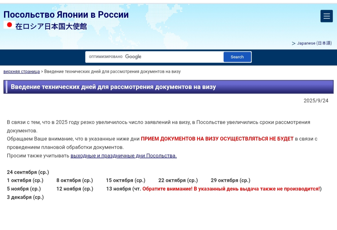 Посольство Японии в Москве продолжает устраивать себе неприемные дни, чтобы разобрать поток заявлений от туристов. Ранее ограничения временно ввели с начала августа, но поток желающих увидеть красные кленовые листочки в период момидзи не ослабевает. Чтобы не увеличивать сроки рассмотрения документов, теперь в Москве не будут принимать документы все среды в октябре и первой половине ноября, плюс даже один четверг.