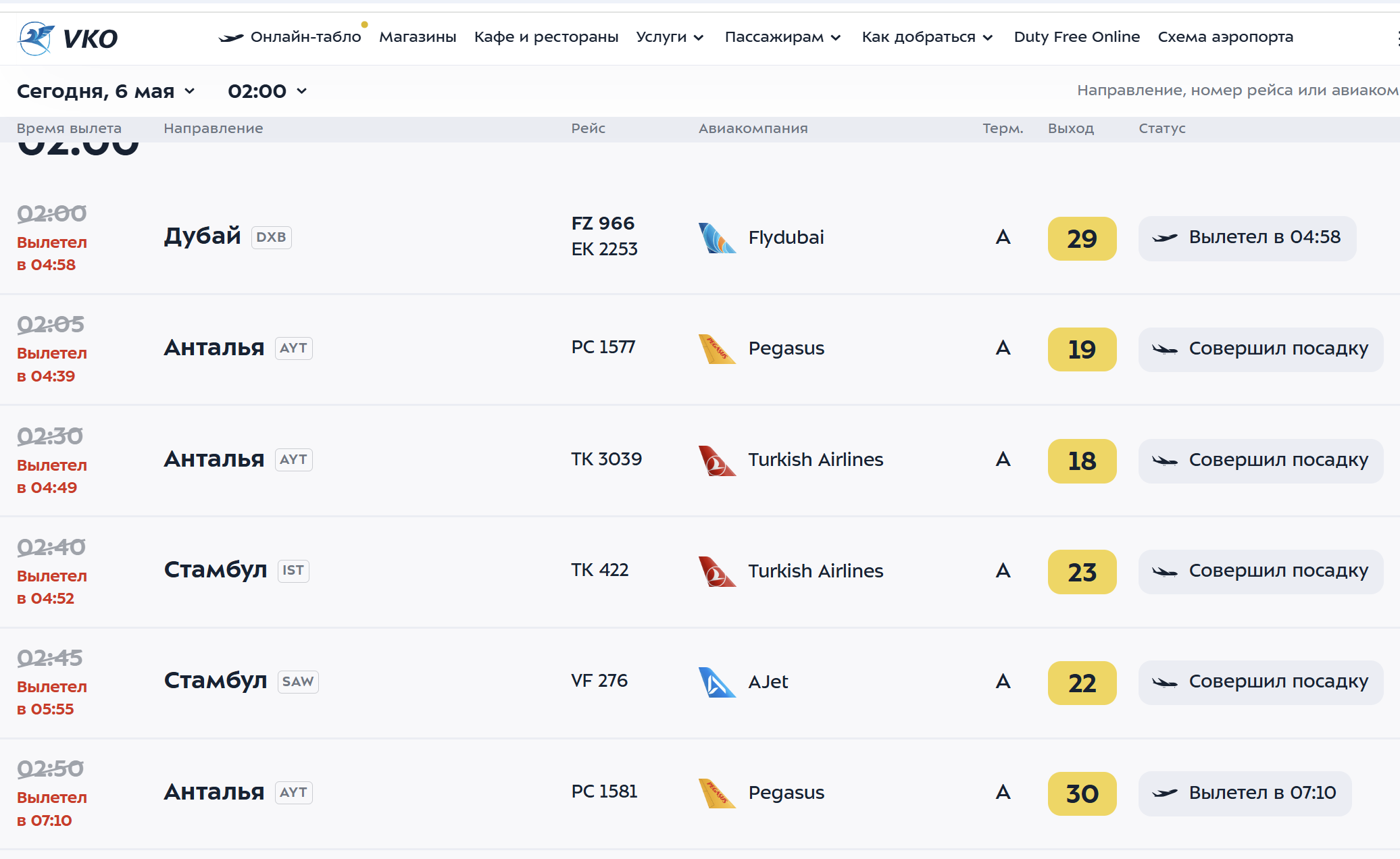 На 4,5 часа позже графика, в 07:50, улетел в ОАЭ самолет flydubai. На 4 часа опоздали с вылетом из Внуково в Стамбул и Анталью AJet и Pegasus соответственно. С таким же отклонением от расписания повез пассажиров в Бодрум борт Turkish Airlines.