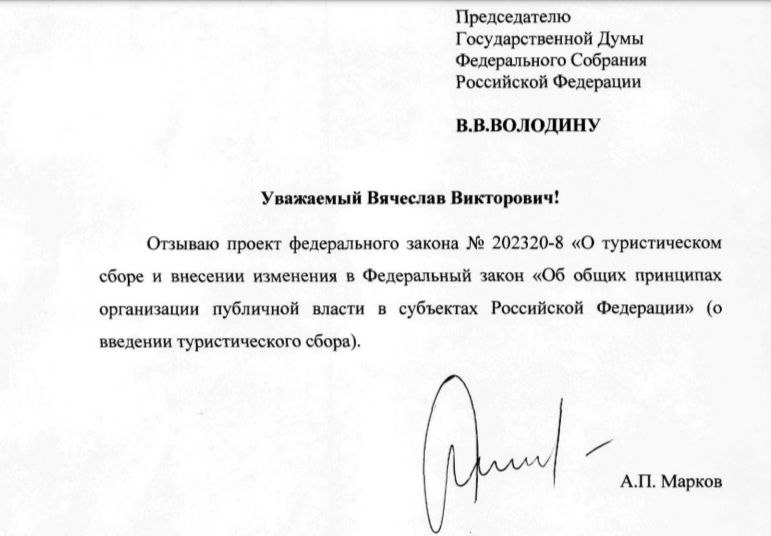 Законопроект о туристическом сборе отозван из Госдумы. В первых числах марта инициативная группа депутатов один за другим сняла свои фамилии с документа. Ну а затем депутат Андрей Марков направил соответствующее письмо на имя председателя Вячеслава Володина. На этой неделе Комитет по туризму и развитию туристической инфраструктуры принял необходимое решение. «Проект оказался не готов и не проработан», – прокомментировал член Общественно-экспертного совета нацпроекта «Туризм и индустрия гостеприимства» Алексей Кожевников.