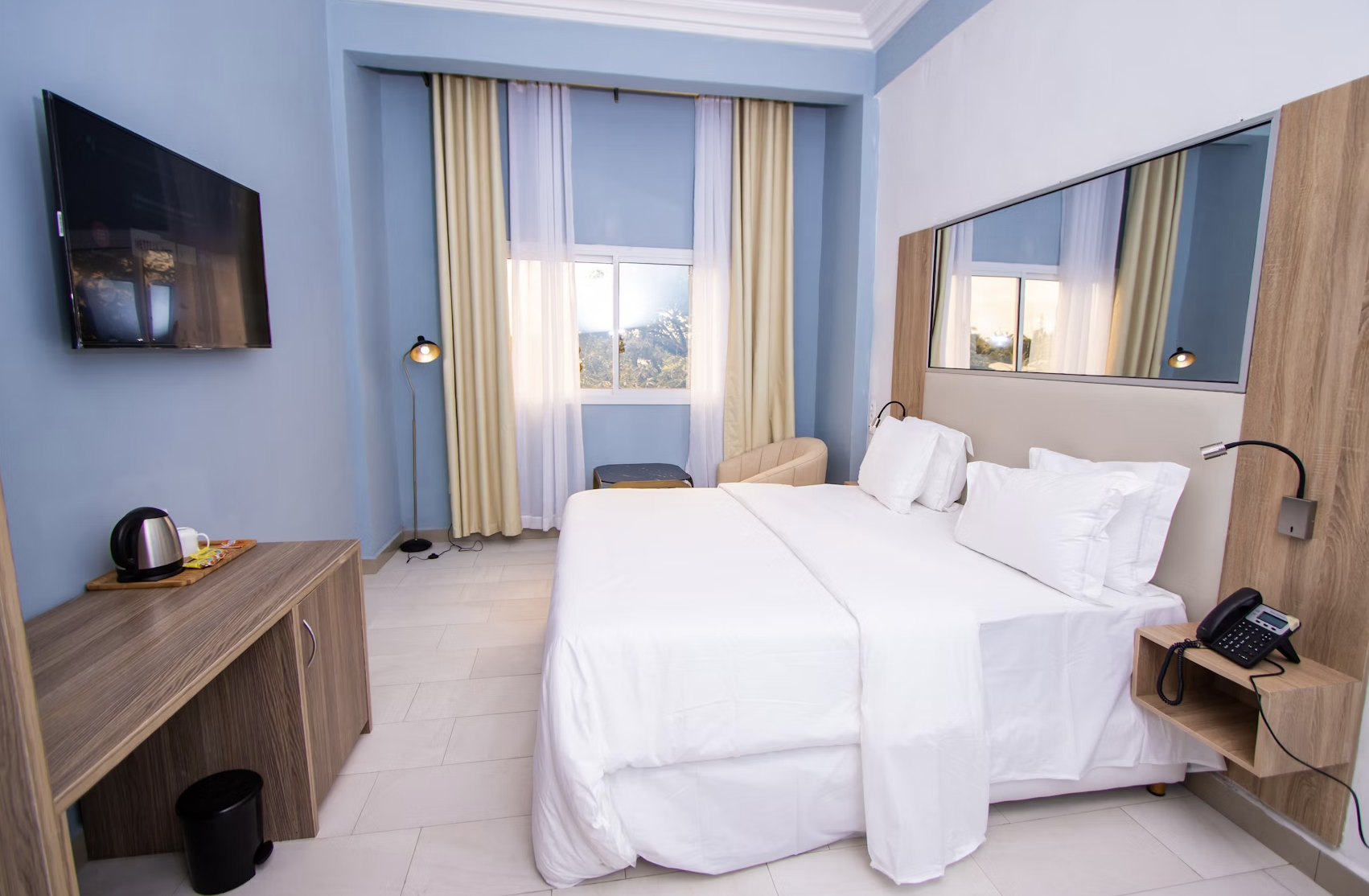 У отдыхающих в 5*, помимо сервисов, доступных в 4*, есть мини-бар, станция для приготовления горячих напитков. В комнате – зеркала в полный рост, розетка у кровати и возможность управления освещением. Постояльцы могут заказывать в номер блюда из ресторана. Вход для гостиничного персонала в жилые корпуса расположен отдельно от двери для гостей.